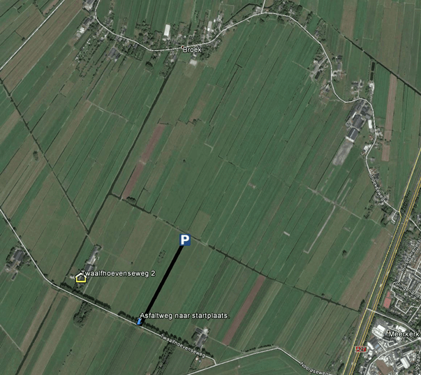 • Na 1,5 km op de Twaalfhoevenseweg: linksaf de asfaltweg op tussen de bomen door met blauwe P-bord.